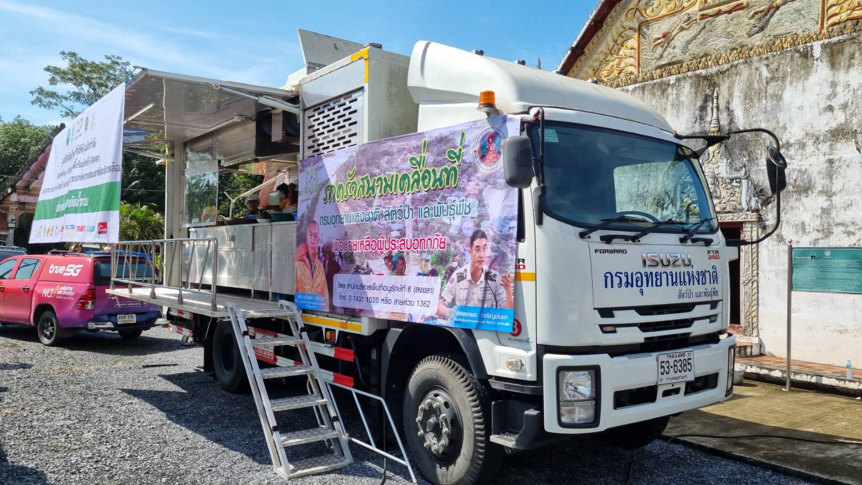 ร่วมกับหน่วยเคลื่อนที่ รถครัวสนามเคลื่อนที่ กรมอุทยานแห่งชาติสัตว์ป่าและพันธุ์พืช จัดทำอาหารแจกจ่ายผู้ประสบอุทกภัย