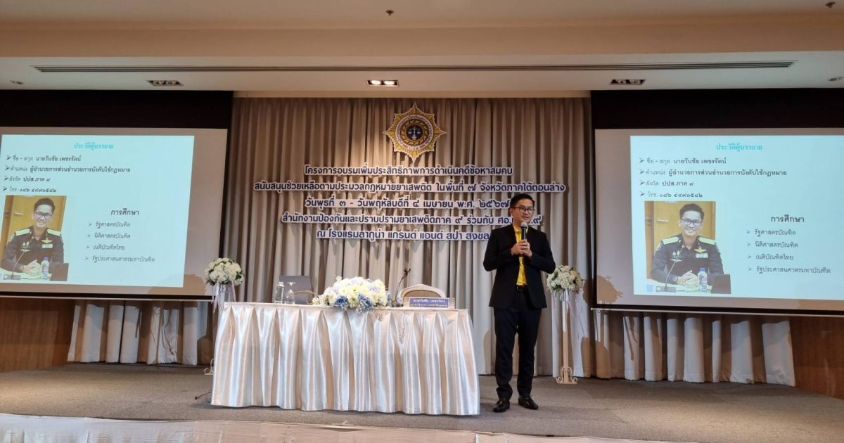 วันที่ 4 เม.ย.67 เวลา 09.00 น. พ.ต.อ.สุริยา ปัญญามัง รอง ผบก.ภ.จว.พัทลุง และ พ.ต.อ.ธนสิทธิ์ จงหวัง รอง ผบก.ภ.จว.พัทลุง เข้าร่วมโครงการอบรมเพิ่มประสิทธิภาพการดำเนินคดีข้อหาสมคบ สนับสนุนช่วยเหลือ ตามประมวลกฏหมายยาเสพติด ในพื้นที่ 7 จว.ภาคใต้ตอนล่าง ณ ห้องลากูน่า ควีนส์ เอ โรงแรมลากูน่า แกรนด์ แอนด์สปาสงขลา จว.สงขลา