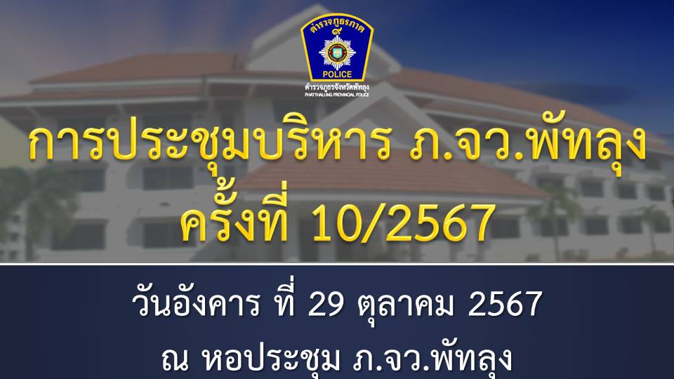 🗓 วันที่ 25 ต.ค.67 ⏰ เวลา 10.00 น. 👮🏻♀️ พล.ต.ต.ณฐกรญ์ กาญจนาภรณ์ ผบก.ภ.จว.พัทลุง พร้อมด้วย –